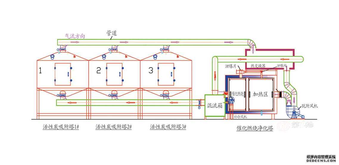 活性炭脫附再生及催化燃燒流程:當(dāng)吸附達(dá)到飽和之后,通過閥門切換進(jìn)行再生。熱空氣進(jìn)入吸附床,對(duì)活性炭進(jìn)行加熱、活性炭受熱解析出較高濃度的有機(jī)氣體,由脫附循環(huán)風(fēng)機(jī)引入催化燃燒床,廢氣經(jīng)催化燃燒生成二氧化碳,水等無害氣體和部分的熱量,熱量回收用于活性炭的解析再生。整套吸附和催化燃燒過程由PLC實(shí)現(xiàn)自動(dòng)控制。
